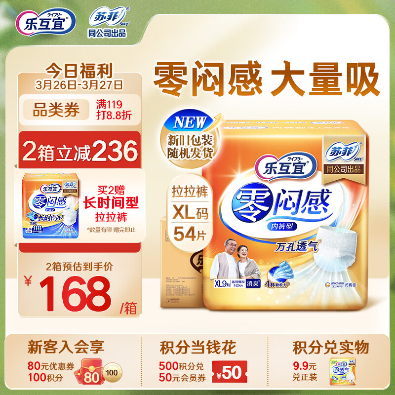 乐互宜零闷感成人拉拉裤老年人透气消臭内裤型纸尿裤XL码箱装54片价格:325.00元!