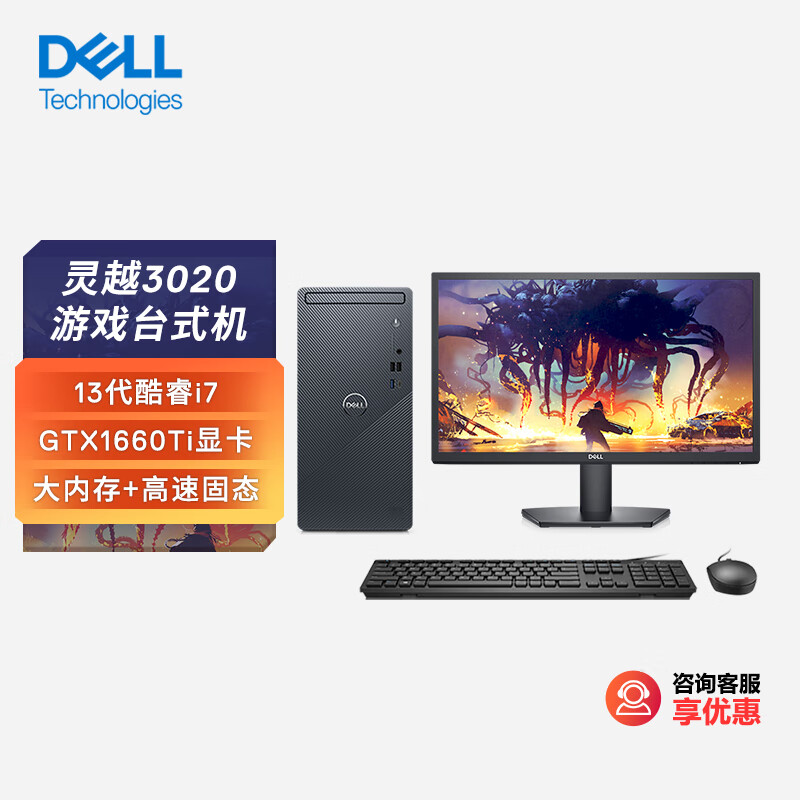 戴尔(DELL)灵越3020 游戏台式电脑主机(酷睿13代i7-13700F 16G 512GSSD GTX1660Ti显卡)21.5英寸显示器价格:7699.00元!
