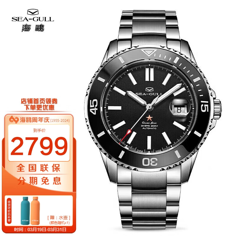 海鸥(SEAGULL)手表男士自动机械表 男表礼物 日历夜光200米防水陶瓷圈潜水腕表价格:3199.00元!