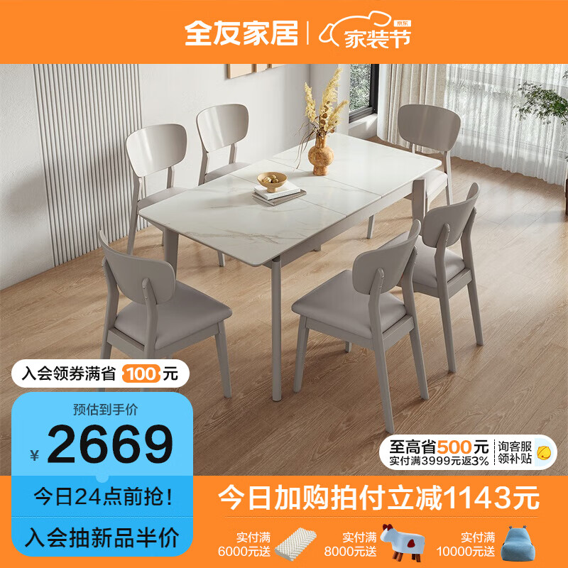 全友家居 餐桌现代简约岩板餐桌长短伸缩功能餐桌长方形桌子DW1120价格:3812.86元!