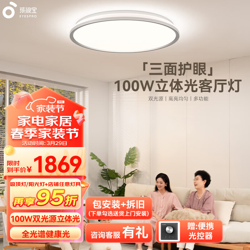 孩视宝客厅大灯护眼吸顶灯卧室书房儿童房防蓝光100W全光谱灯具AH37A-T价格:2119.00元!