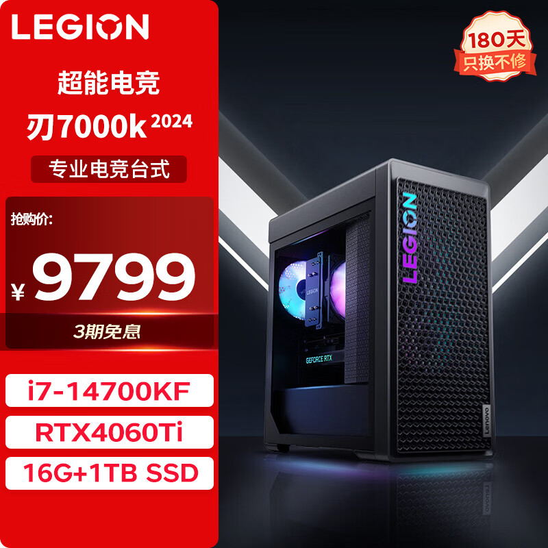 联想(Lenovo)拯救者刃7000K 2024游戏电竞电脑主机(酷睿14代i7-14700KF RTX4060Ti 8GB显卡 16G 1T SSD)价格:9799.00元!