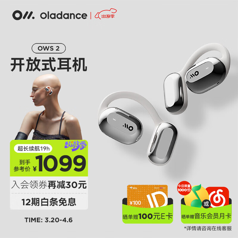 Oladance OWS2全开放式耳机适用苹果华为无线蓝牙不入耳防漏音通话清晰超长续航 星行银宙价格:1099.00元!