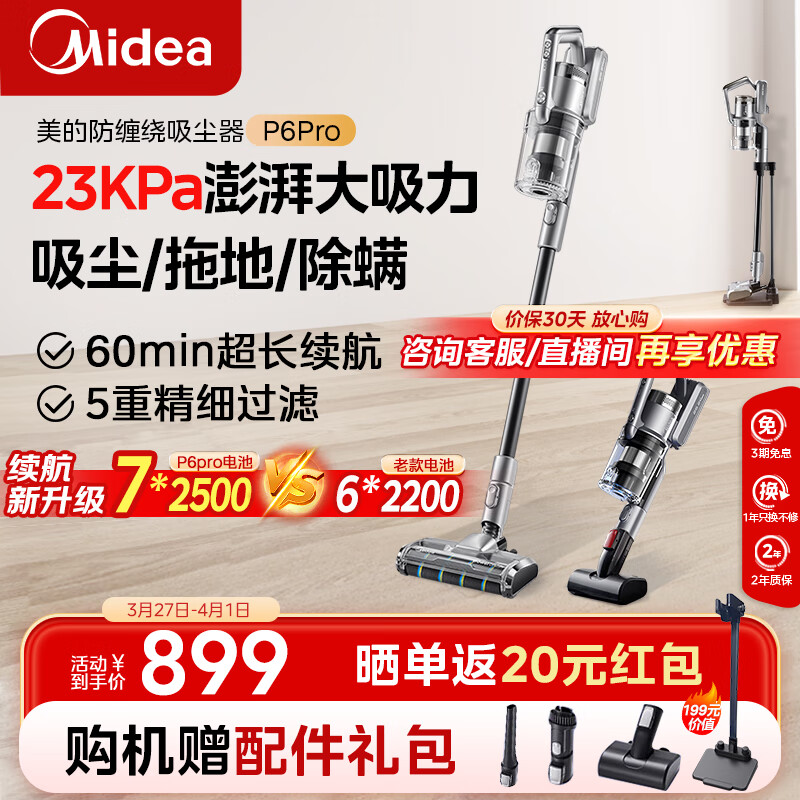 美的(Midea)吸尘器家用 P6 Pro 手持无线洗地机吸拖一体机 大吸力吸尘器除螨仪 车载除螨宠物家庭适用价格:899.00元!