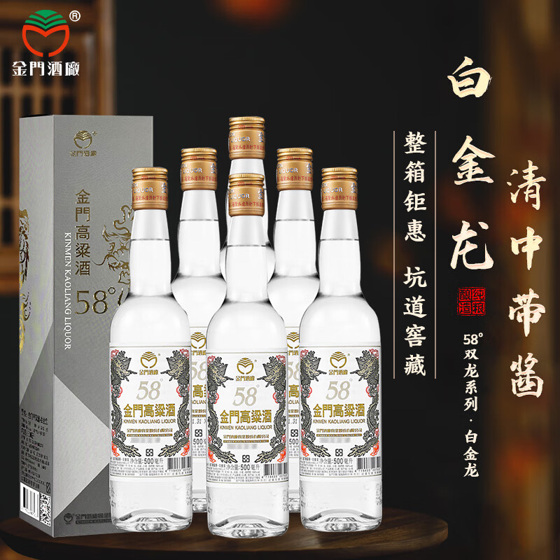 金门高粱 白金龙 清香型白酒 58度 500ml*6瓶 整箱装 【宴请送礼】价格:1093.00元!