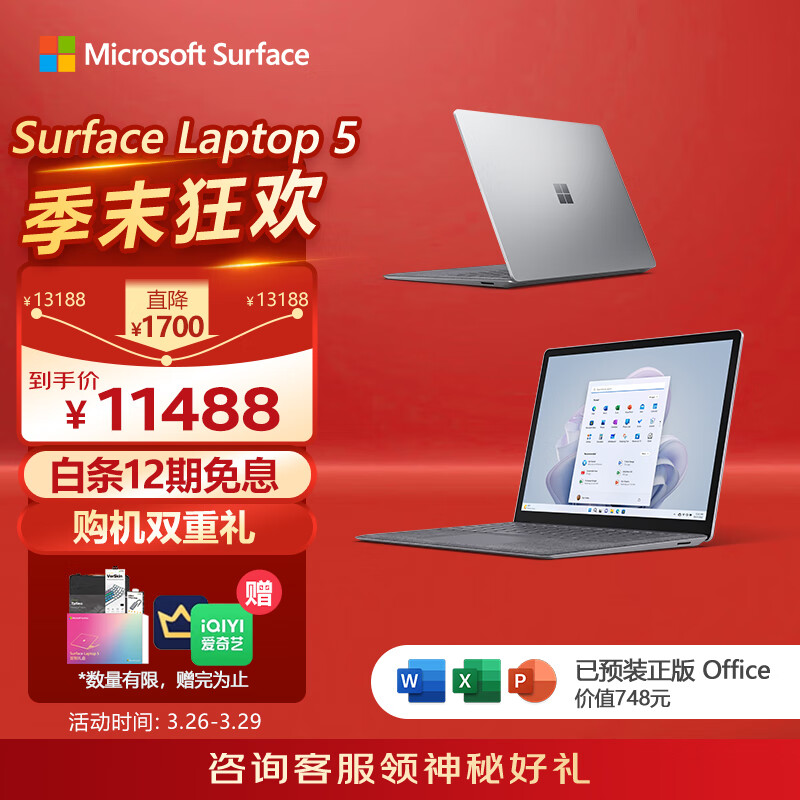 微软Surface Laptop 5 轻薄办公笔记本电脑 i7 16G+512G 亮铂金 Evo认证 13.5英寸 2.2K高色域触控屏价格:11488.00元!