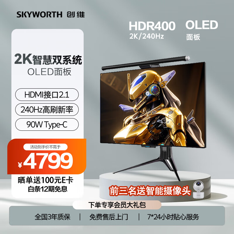 创维(Skyworth) 26.5英寸 OLED 电竞显示器 2K 240Hz 无线投屏 90W Type-C 杜比认证 双系统 标配挂灯 F27G80Q价格:5999.00元!
