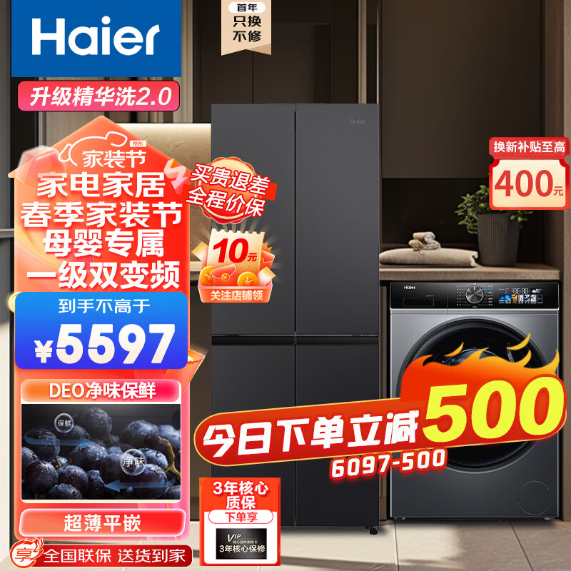 海尔(Haier)405升十字对开门冰箱家用一级能效风冷无霜冰箱+10公斤超薄精华洗滚筒洗衣机【K39pro】12519价格:5597.00元!