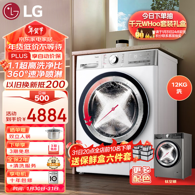 LG小旋风系列 12kg超薄家用洗衣机全自动 直驱变频 旋风速净洗 洗净比1.1 360°速净喷淋 FCW12Y4WA白价格:5484.00元!
