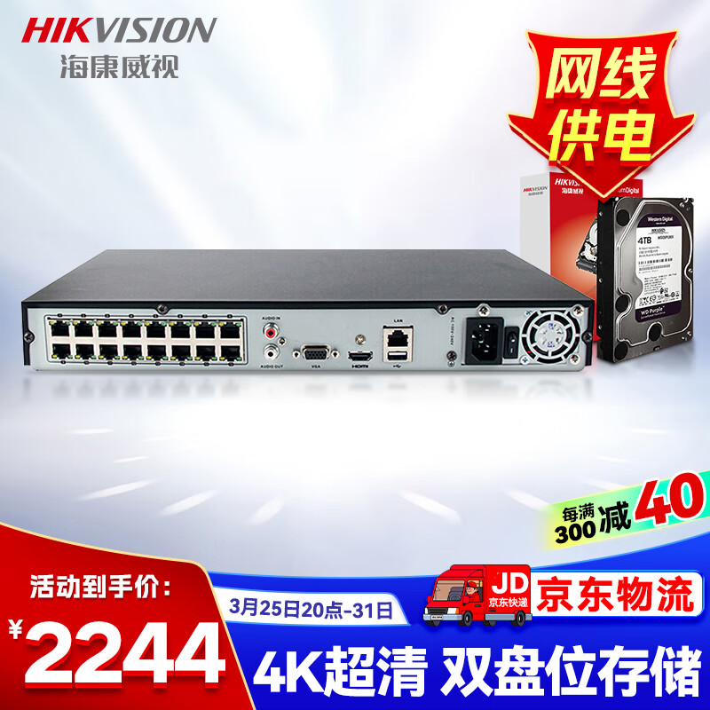 HIKVISION海康威视网络硬盘录像机监控POE网线供电满配16个摄像头带4T硬盘DS-7816N-Q2/16P价格:2594.00元!