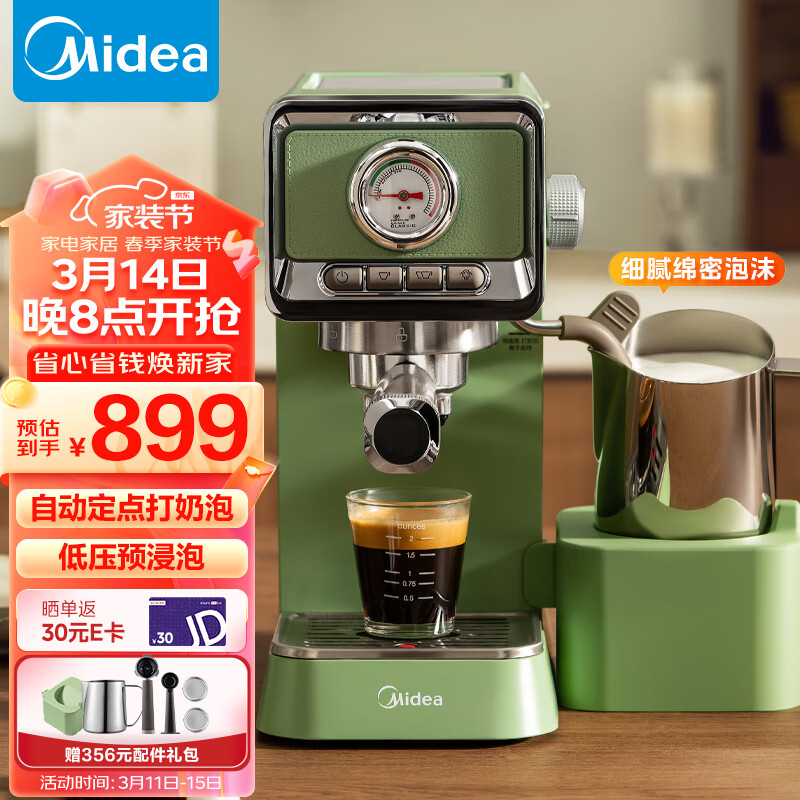 美的(Midea)意式咖啡机1.2L云朵奶泡咖啡机半自动浓缩泵压式一体咖啡机复古咖啡机家用咖啡壶双杯咖啡机E05价格:899.00元!