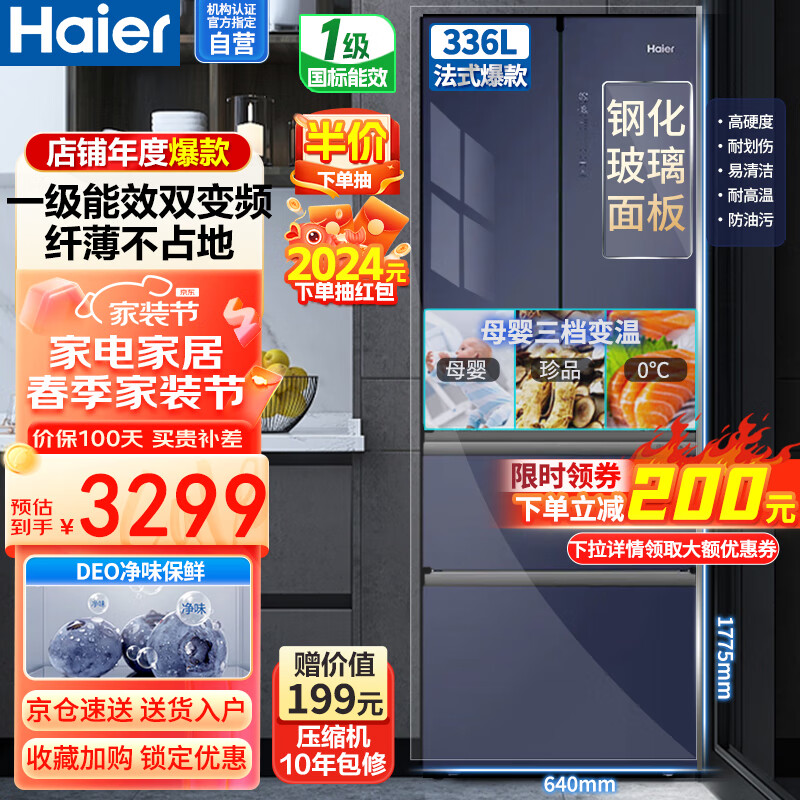 海尔(Haier)冰箱336升家用法式多门风冷无霜一级能效双变频大容量母婴变温净味钢化玻璃面板BCD-336WLHFD8DB1价格:3299.00元!