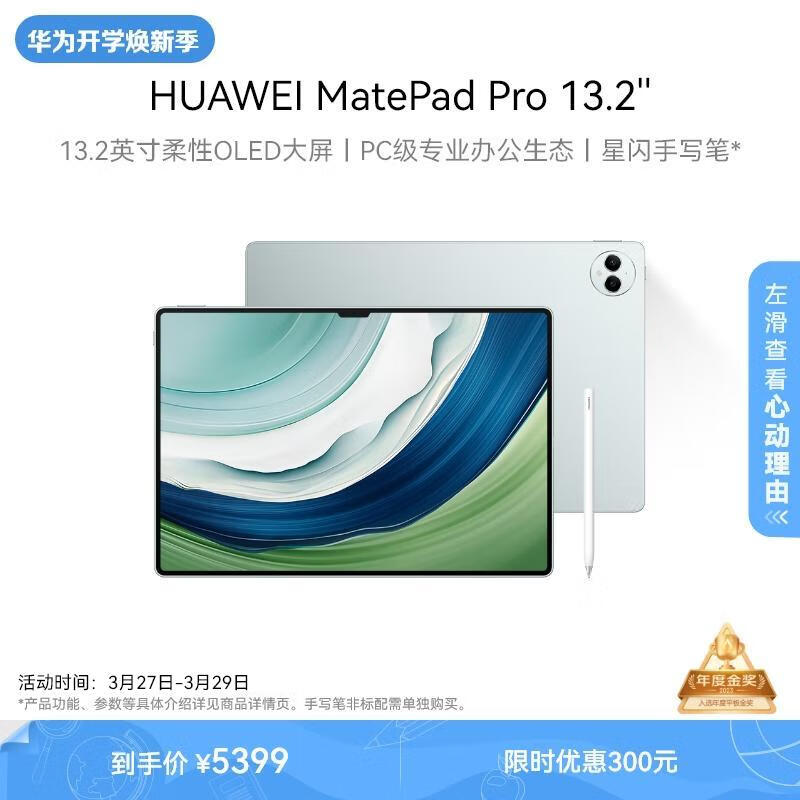 HUAWEI MatePad Pro 13.2英寸 华为平板电脑144Hz OLED柔性护眼屏星闪连接办公创作12+256GB WiFi 雅川青价格:5399.00元!
