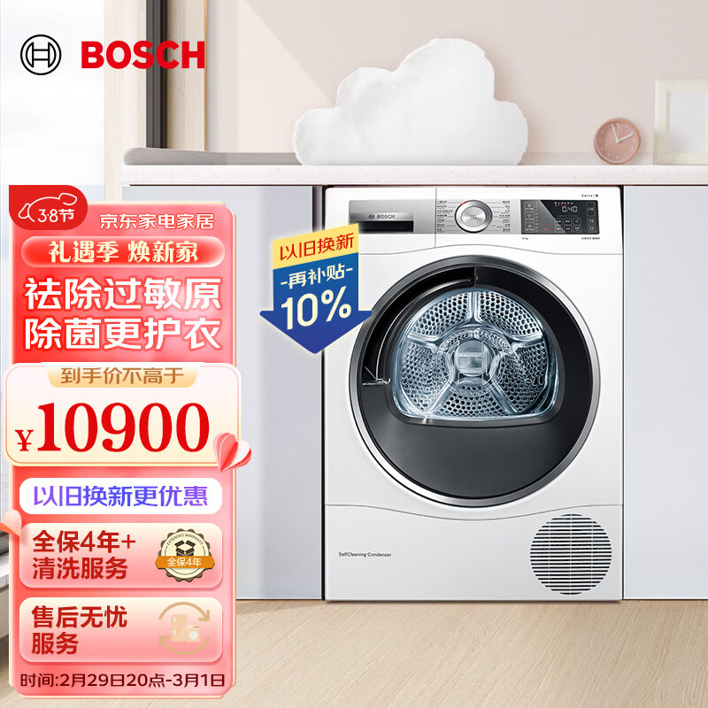 博世(BOSCH)烘干机家用【云朵白】10公斤大容量热泵干衣机微米级深层过滤除菌除螨专业护衣WQC455D00W价格:10900.00元!