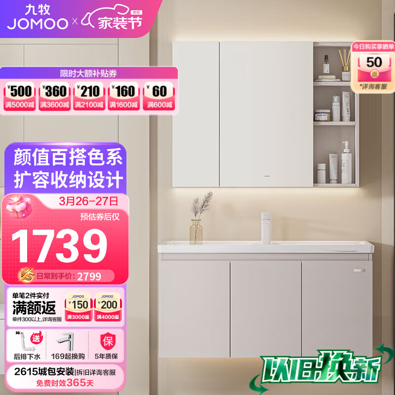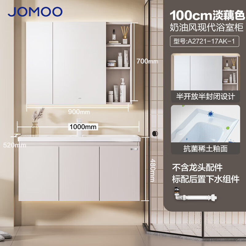 九牧(JOMOO)极简浴室柜陶瓷一体盆悬挂式洗脸洗手组合柜100cm A2721-17AK-1价格:2229.00元!