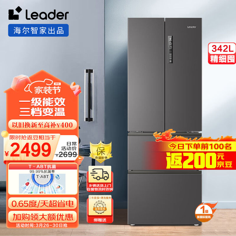 Leader 海尔智家出品342升风冷无霜一级能效双变频变温节能法式四门多门家用电冰箱BCD-342WLLFDD9S9价格:2699.00元!