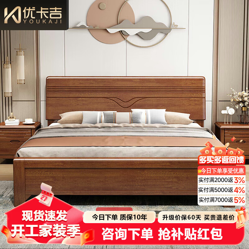 优卡吉胡桃木实木床新中式双人1.5/1.8米储物668# 1.5米箱框床+10cm棕垫价格:2599.00元!