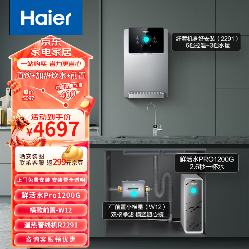 海尔(Haier)净水器1200G鲜活水 pro家用净水机6年RO净水器+前置过滤器+管线机HKC3000-R793D2U1+横置W12+R2291价格:4697.00元!