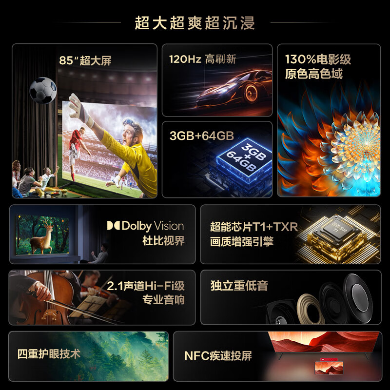 2、这款85寸大电视性价比很高,色彩非常的鲜艳,屏幕够大够震撼,配置比较高,操作非常的丝滑,音响非常棒,低音很浑厚,立体感很强。