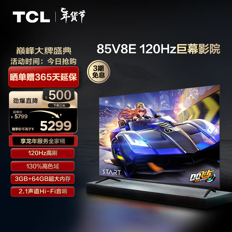 TCL电视 85V8E 85英寸 120Hz 高色域 3+64GB 2.1声道音响 4K高清巨幕 客厅液晶智能平板游戏电视机价格:5199.00元!