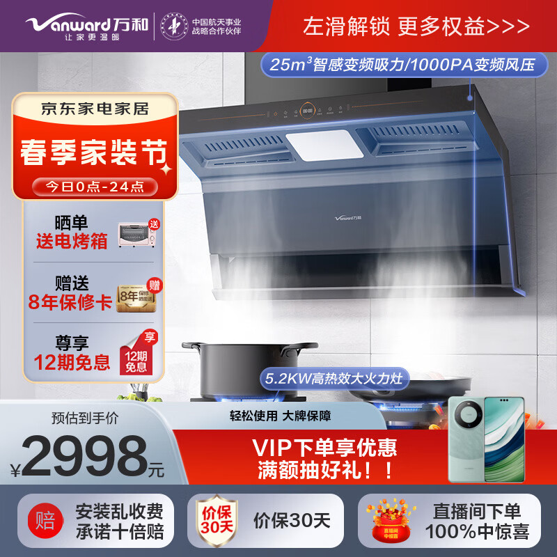 万和(Vanward)顶侧双吸1000Pa三腔直流变频家用抽油烟机 燃气灶具烟灶套装 25m3/min大吸力 WL860+G8L90(天然气)价格:2998.00元!