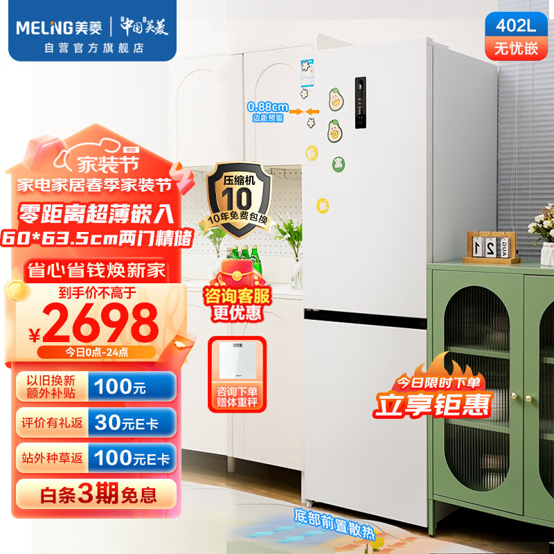 美菱(MeiLing)【无忧嵌】402升零距离嵌入式冰箱家用大容量双拼门双开门冰箱底部散热BCD-402WPCZX雪域白价格:2698.00元!