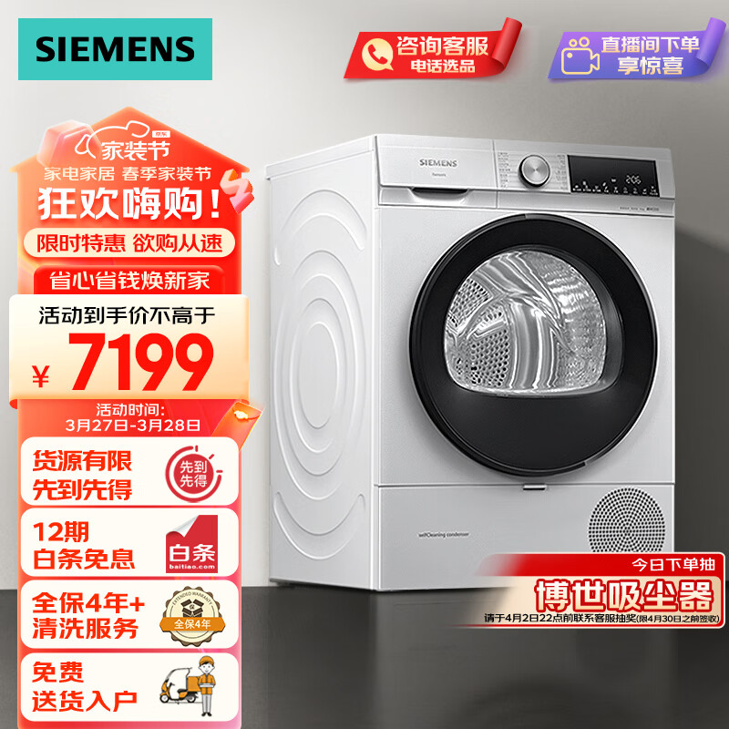 西门子(SIEMENS) 烘干机家用 10公斤热泵干衣机 除菌除螨 防缠绕舒展烘 蚕丝被专护 WQ55A2D00W价格:7199.00元!