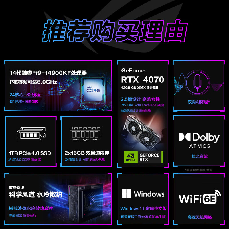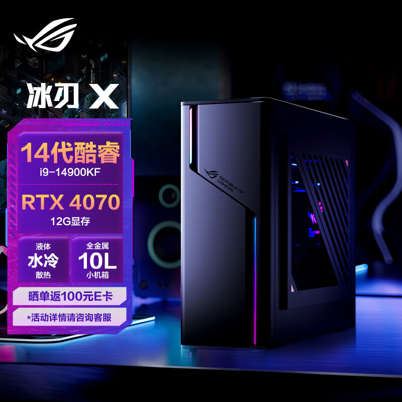 ROG冰刃X 2024 水冷电竞游戏台式机电脑主机(14代酷睿i9-14900KF 32G 1TB SSD RTX4070 12G 10L机箱)价格:15999.00元!