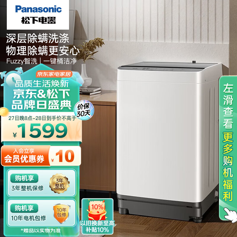 松下(Panasonic)洗衣机全自动10kg波轮洗衣机家用大容量节能省水除螨洗人工智能 桶洗净 XQB100-T31FF 精选价格:1599.00元!