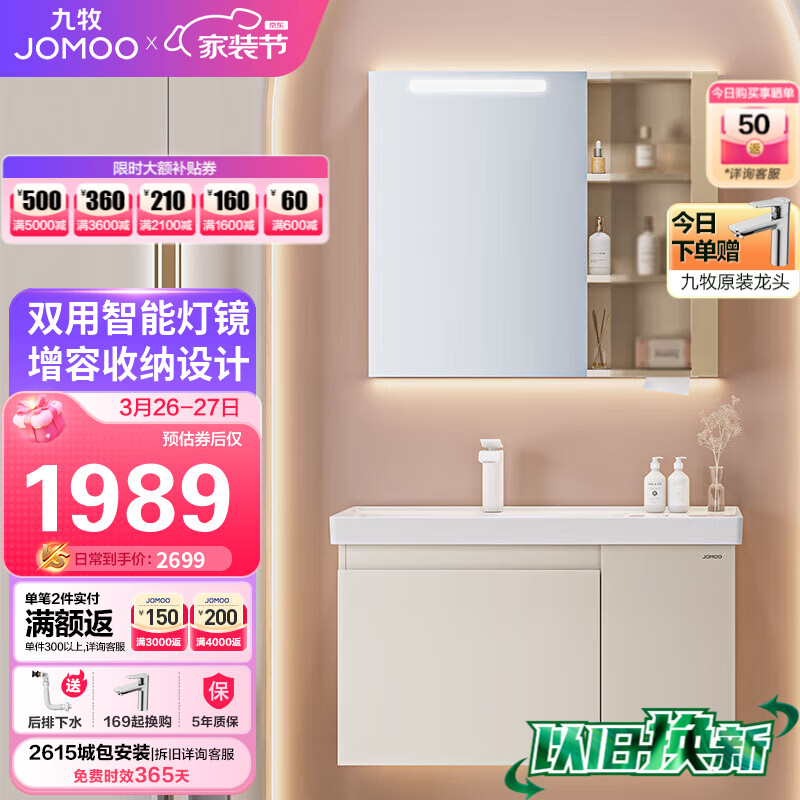 九牧(JOMOO)浴室柜陶瓷一体盆智能悬挂抗菌洗脸盆柜组合 80cm A2729-14BI-2价格:2519.00元!