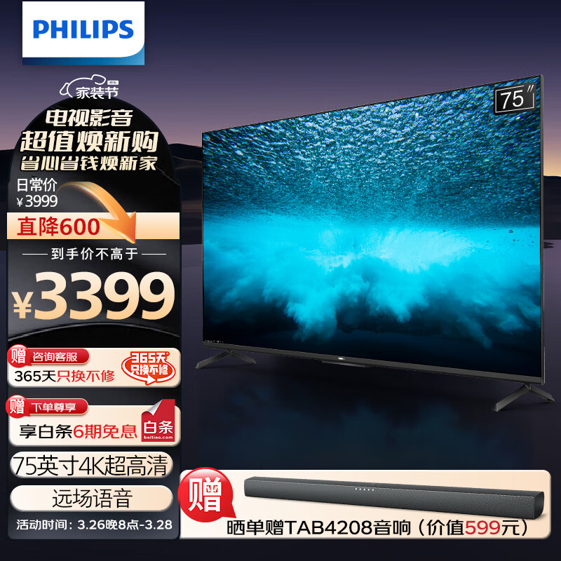 飞利浦(PHILIPS)75英寸4K超高清智慧屏 MEMC运动防抖 远场AI语音智能平板液晶电视机75PUF7297/T3以旧换新价格:3399.00元!