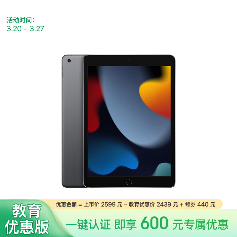 Apple/苹果【教育优惠】iPad 10.2英寸平板电脑 2021款(64GB WLAN版/MK2K3CH/A)深空灰色价格:2439.00元!