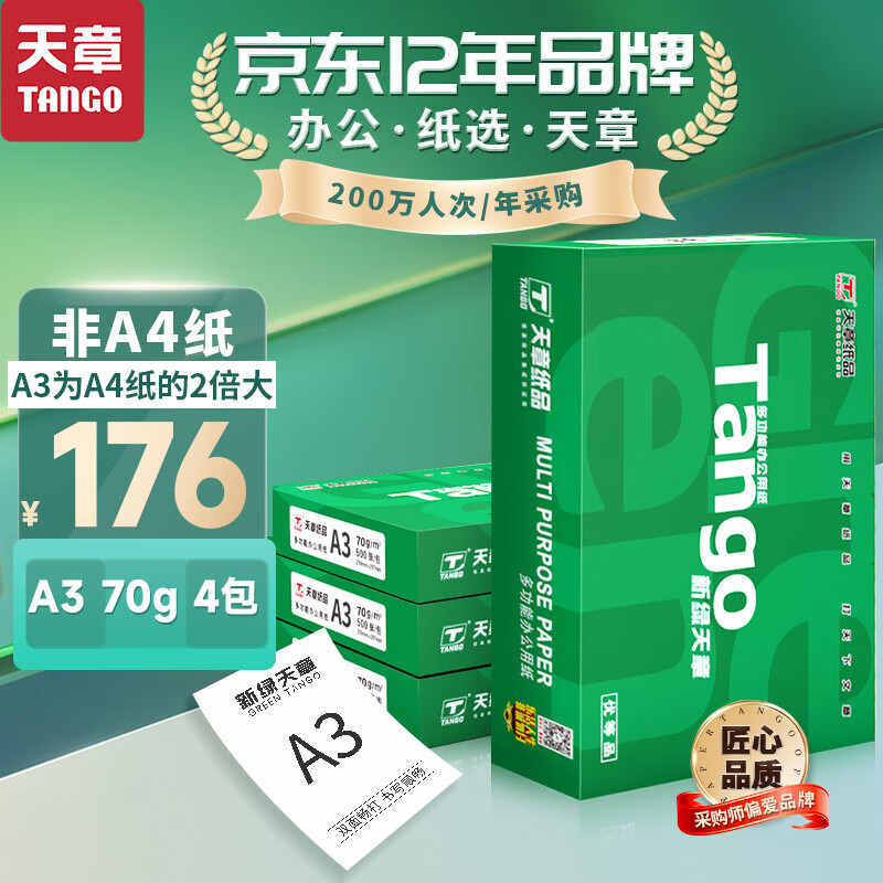 天章 (TANGO)新绿天章A3打印纸 70g 500张*4包 明星复印纸 双面工程绘图纸 手抄报画纸 整箱2000张【品质款】价格:176.00元!
