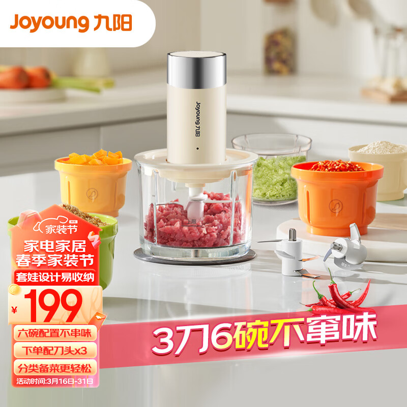 九阳(Joyoung)绞肉机 家用套娃式六碗三刀佐料机 多功能辅食机电动料理机捣蒜器 搅拌机绞馅机辅食机价格:199.00元!