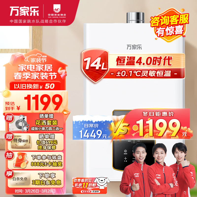 万家乐 13升燃气热水器电家用恒温即热式天然气 水量伺服器智能变升节能随温感JSQ26-13D6S(F)价格:1199.00元!