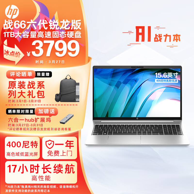 惠普(HP)战66 六代 锐龙版15.6英寸轻薄笔记本电脑(锐龙高性能R7 16G 1T 长续航 高色域低蓝光 AI新体验)价格:3799.00元!