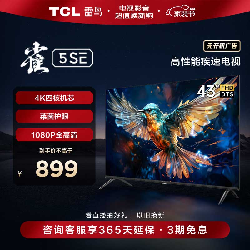 TCL雷鸟 雀5SE 43英寸电视 全高清 超薄屏客厅电视 1G+8G 教育电视 智能液晶平板电视机43F175C价格:899.00元!