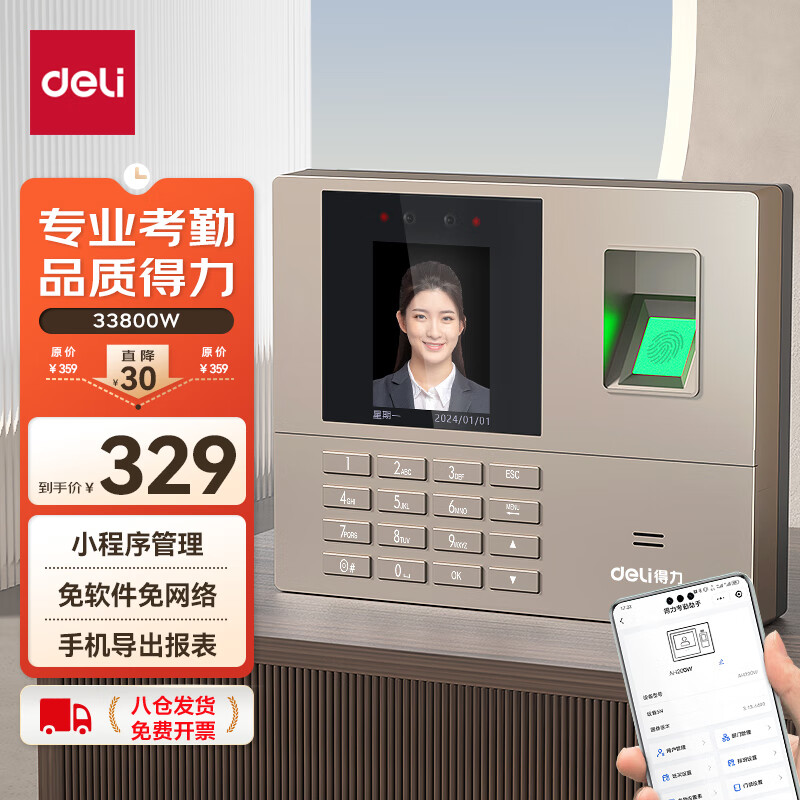 得力智能考勤机 打卡机人脸+指纹 打卡考勤机 蓝牙连接 小程序管理 无需网络 小程序升级版33800W价格:359.00元!