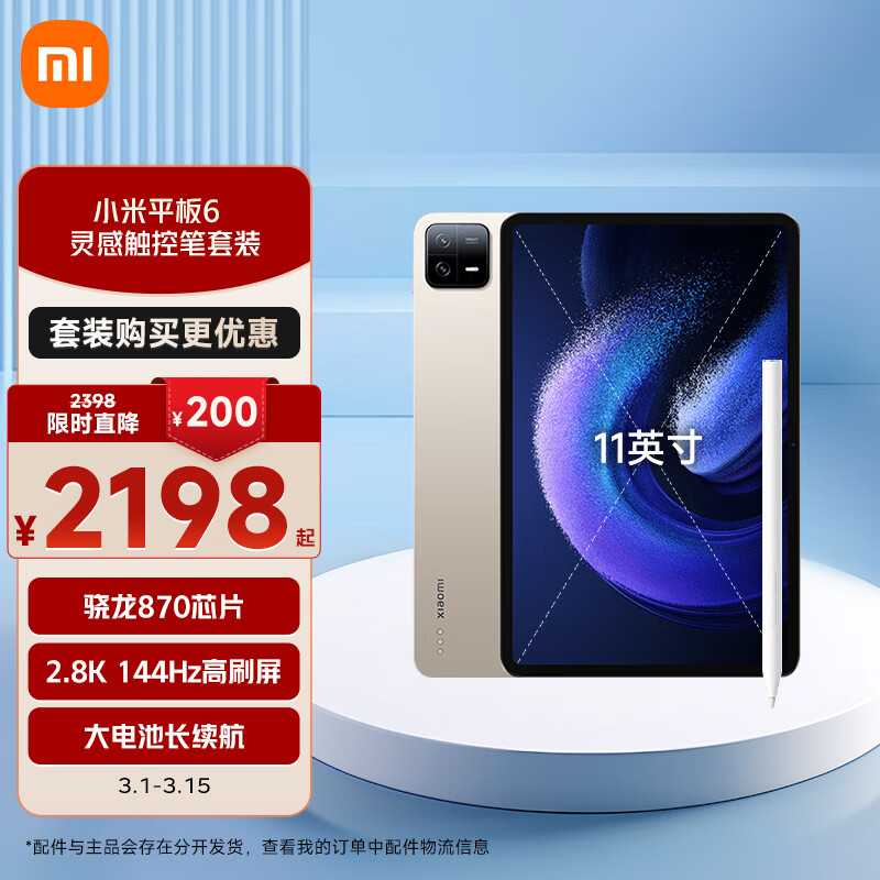 小米平板6 11英寸 骁龙870 144Hz 2.8K 6+128GB 会议笔记 移动办公娱乐平板电脑 金色【触控笔套装】价格:2198.00元!