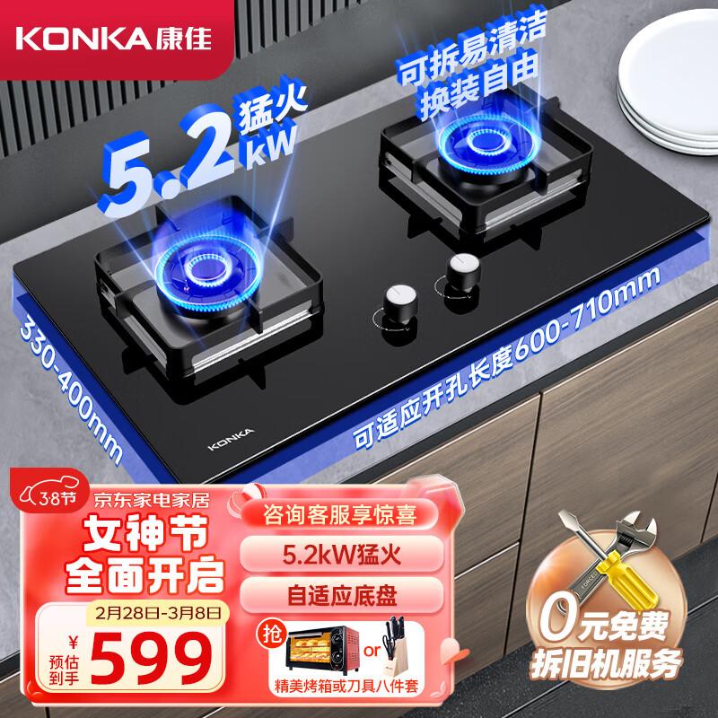 康佳(KONKA)燃气灶煤气灶双灶家用 5.2kW大火力 可调节底盘 63%热效率 易清洁铝炉头 JZT-KY01B(天然气)价格:599.00元!