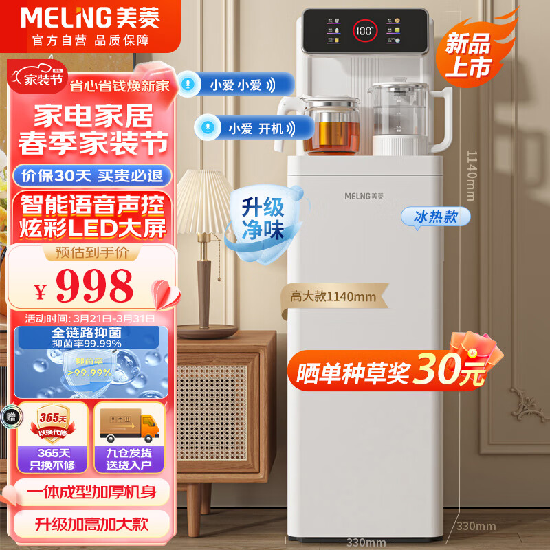 美菱(MeiLing)智能语音茶吧机大屏遥控立式饮水机下置水桶一体柜家用办公全自动机冷热款MY-C231B(语音款)价格:998.00元!