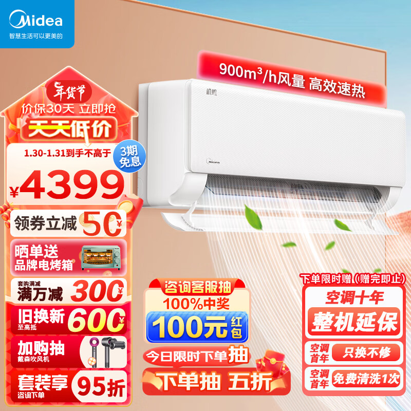 美的(Midea)空调 2匹挂机 机煌 新一级能效 壁挂式全直流变频 冷暖大风量 低噪 KFR-46GW/JH1-1价格:4399.00元!