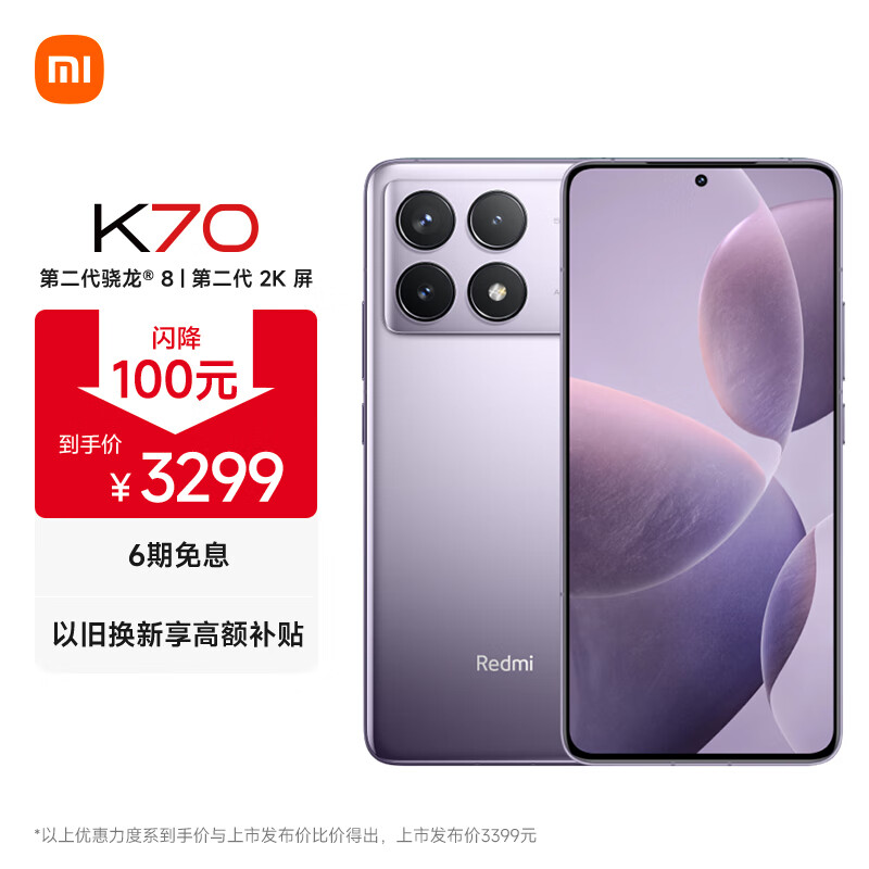 小米Redmi K70 第二代骁龙8 小米澎湃OS 16GB+1T浅茄紫 红米5G手机 SU7 小米汽车互联价格:3299.00元!