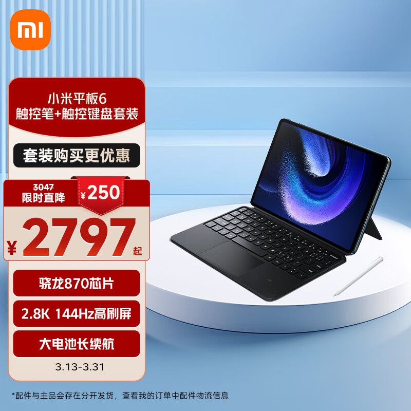 小米平板6 11英寸 骁龙870 144Hz 2.8K 8+128GB 会议移动办公娱乐平板电脑 黑色【触控笔+键盘套装】价格:2747.00元!