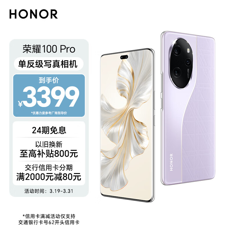 荣耀100 Pro 单反级主摄 荣耀绿洲护眼屏 第二代骁龙8旗舰芯片 立体声双扬声器 OIS 12+256 莫奈紫 5G价格:3299.00元!