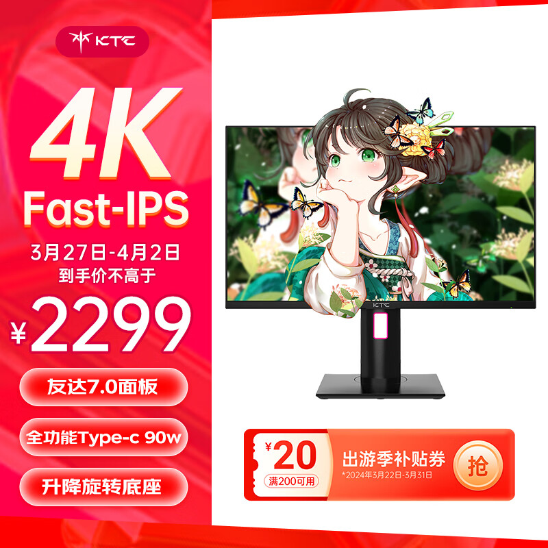 KTC 27英寸 电脑显示器 原生4k160Hz FastIPS1msHDR400100%sRGB升降旋转壁挂电竞4k显示屏 H27P22Pro价格:2649.00元!