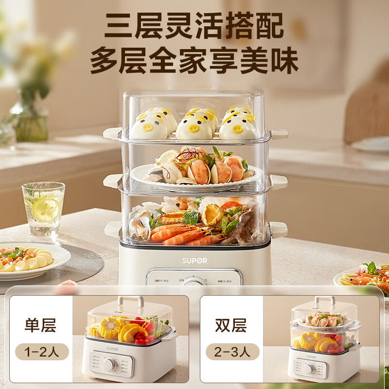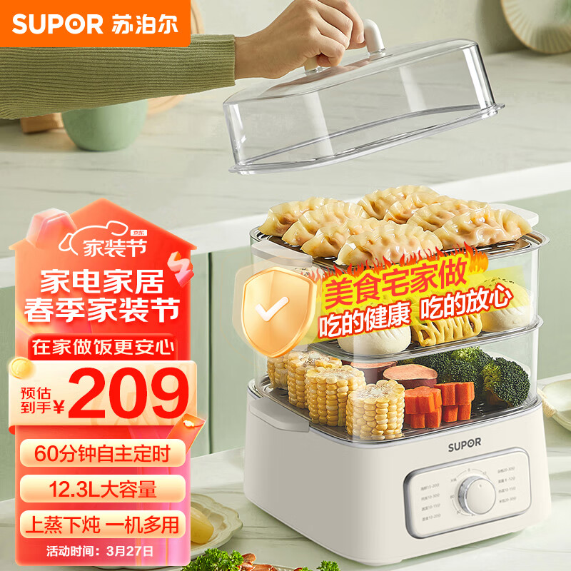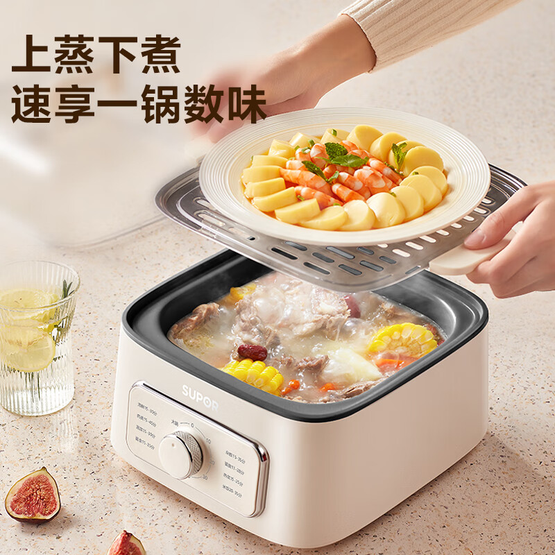 苏泊尔(SUPOR)电蒸锅 电煮锅 多功能家用电热锅 电火锅 蒸蛋器 蒸包子三层大容量12.3L可定时多用途锅ZN23FK830价格:209.00元!
