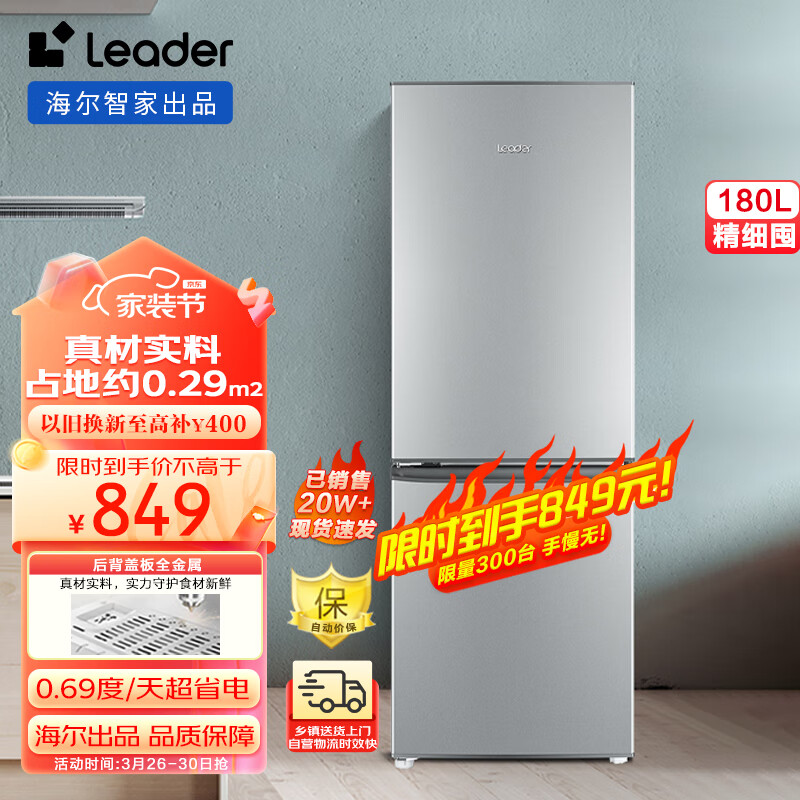 Leader 海尔智家出品180升两门二门双门小冰箱家用小型租房省电低噪音不占地方电冰箱BCD-180LLC2E0C9价格:849.00元!