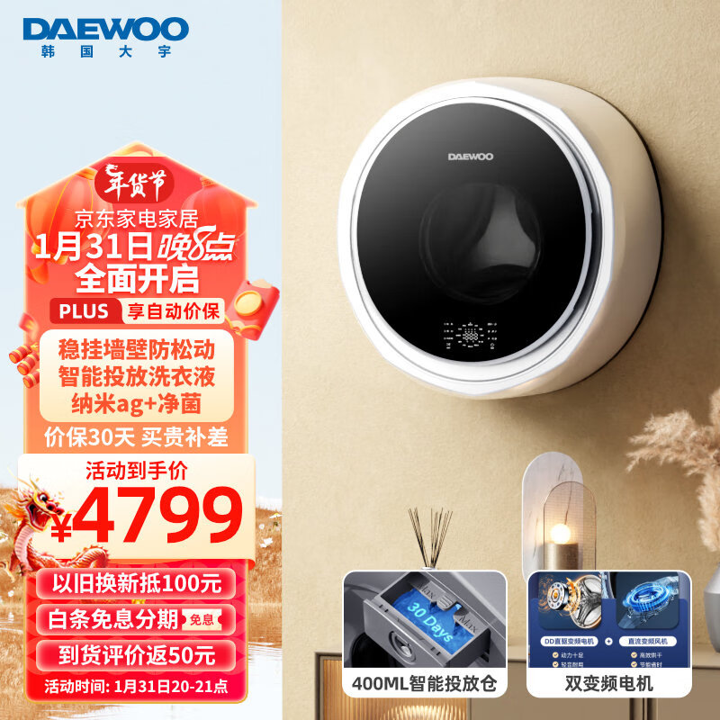 大宇(DAEWOO)3公斤壁挂洗衣机洗烘一体滚筒洗衣机全自动内衣洗 dd直驱变频 智能投放 DY-BGX06Hpro 皎月白价格:4999.00元!