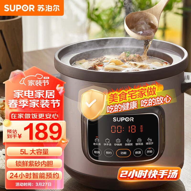 苏泊尔(SUPOR)电炖锅 电砂锅 电炖盅 炖汤盅煲汤锅 紫砂锅 燕窝炖盅 煮粥神器 熬粥专用锅 5L大容量 DG50YC872价格:189.00元!